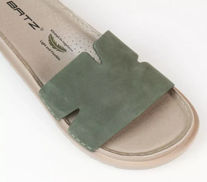 Batz Alice Olive női papucs Zöld színben. Felsőrésze: Valódi bőr felsőrész, belsőrésze: puha bőr belsőrész, talprésze: szintetikus talp.. Sarokmagasság:
