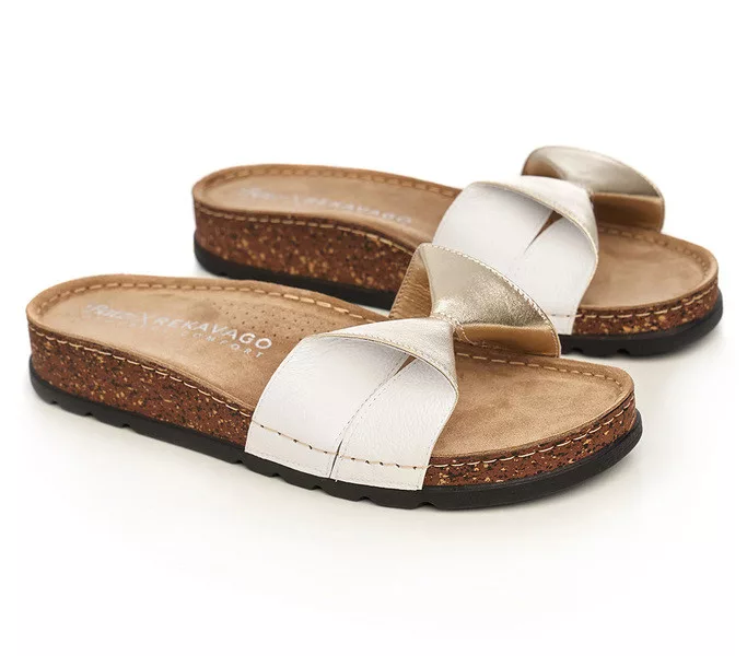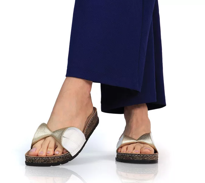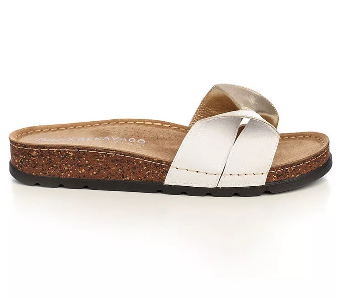 Batz Pretty day Arany Női papucs Arany-Fehér színben. Felsőrésze: Designer modell, belsőrésze: Masnira emlékeztető csavart mintás felsőrész, talprésze: Parafához hasonló. Sarokmagasság: 2,5 cm