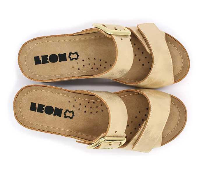 Leon Comfort 1110 arany női papucs arany színben. Felsőrésze: Bőr felső, belsőrésze: Bőr belső, talprésze: szintetikus talp. Sarokmagasság:
