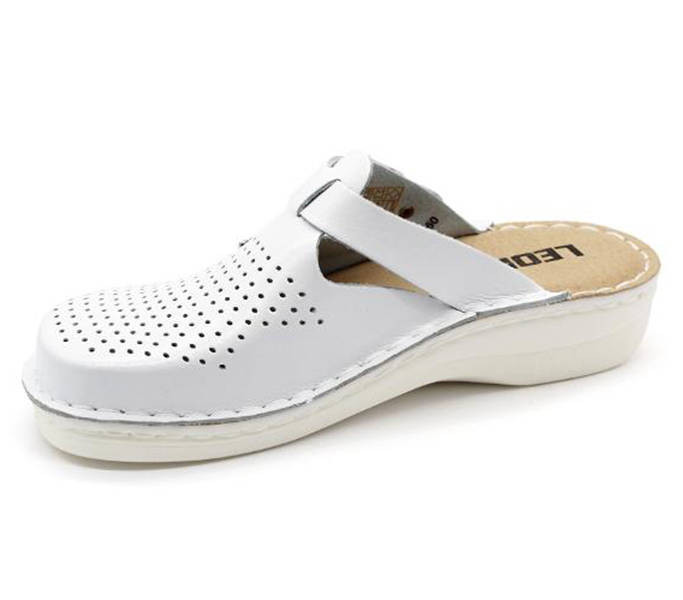 Leon Comfort V260 Fehér női papucs Fehér színben. Felsőrésze: Bőr felső, belsőrésze: bőr belső, talprésze: szintetikus talp. Sarokmagasság: 2,5 cm