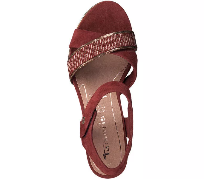 Tamaris 1-28350-24 557 női szandál Piros színben. Felsőrésze: bőr-textil felső, belsőrésze: bőr belső, talprésze: szintetikus talp. Sarokmagasság: 7